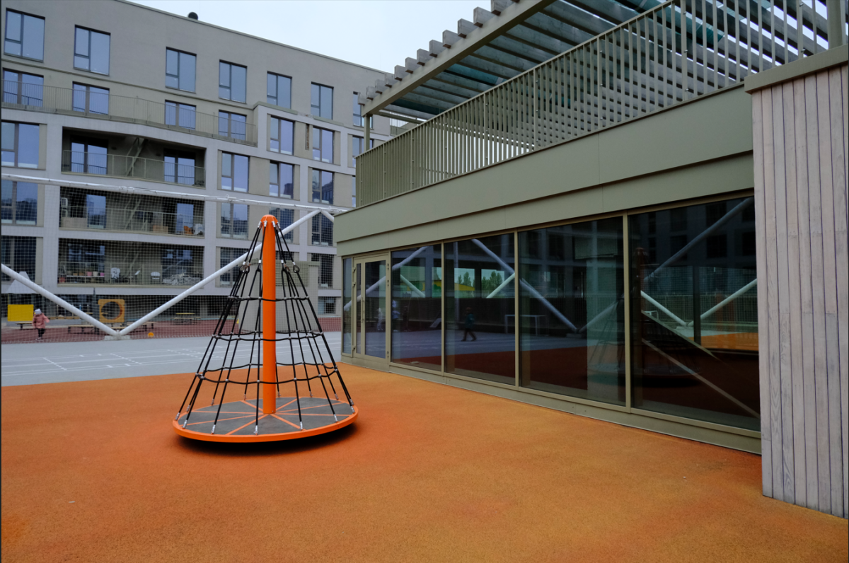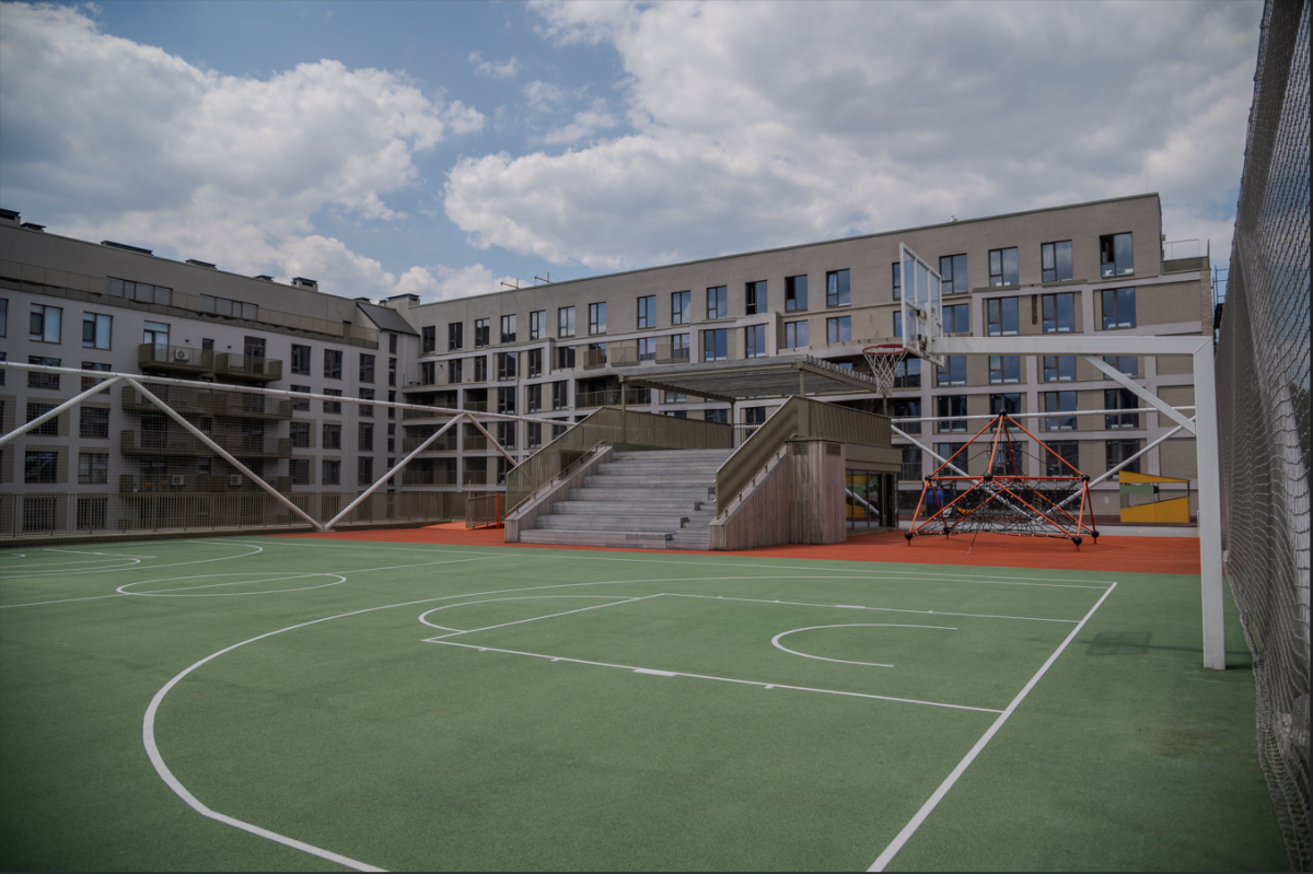 - Класичний спортивний зал, відкритий спортивний простір на даху школи із захисною сіткою, дитячий майданчик